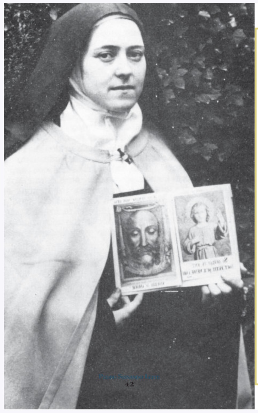 1873년 1월생인 성녀 소화 데레사는 1897년 9월 30일에 24세의 나이로 사망하였는데, 그녀의 죽음으로부터 1년도 채 안 된 1898년 5월 28일 이탈리아 사진작가였던 세콘도 피아Secondo Pia가 토리노 대성당에 모셔져 있던 예수님의 수의를 첫 번째로 촬영하면서 수의의 비밀을 밝히고, 수의에 찍힌 예수님의 얼굴을 온 세상에 알린 바 있지만, 사실 성녀의 예수님의 거룩한 얼굴에 대한 신심은 유럽에서 이미 그 당시 널리 퍼져있던 신심이었다. 사진에서 성녀가 들고 있는 예수님의 얼굴 모습은 매년 성금요일에 베드로 대성당에서 공경하던 성화를 ‘투르의 거룩한 분(the holy man of Tours)’ 혹은 ‘성면의 사도(the apostle of the Holy Face)’라고까지 불리던 레옹 뒤퐁Leon Papin-Dupont(1797~1876년)이 로마에서 프랑스 투르 시로 가져온 성화의 복사본이다. 뒤퐁씨 사후 그분의 미망인이었던 부인이 그 성화를 모시고 집에서 기도하던 중 기적을 체험했다고 알려진다. 이로부터 투르의 가르멜회 마리 드 생 피에르Marie de Saint Pierre(1816~1848년) 수녀가 예수님의 성면에 대한 신심을 처음 시작한 것으로 알려진다.